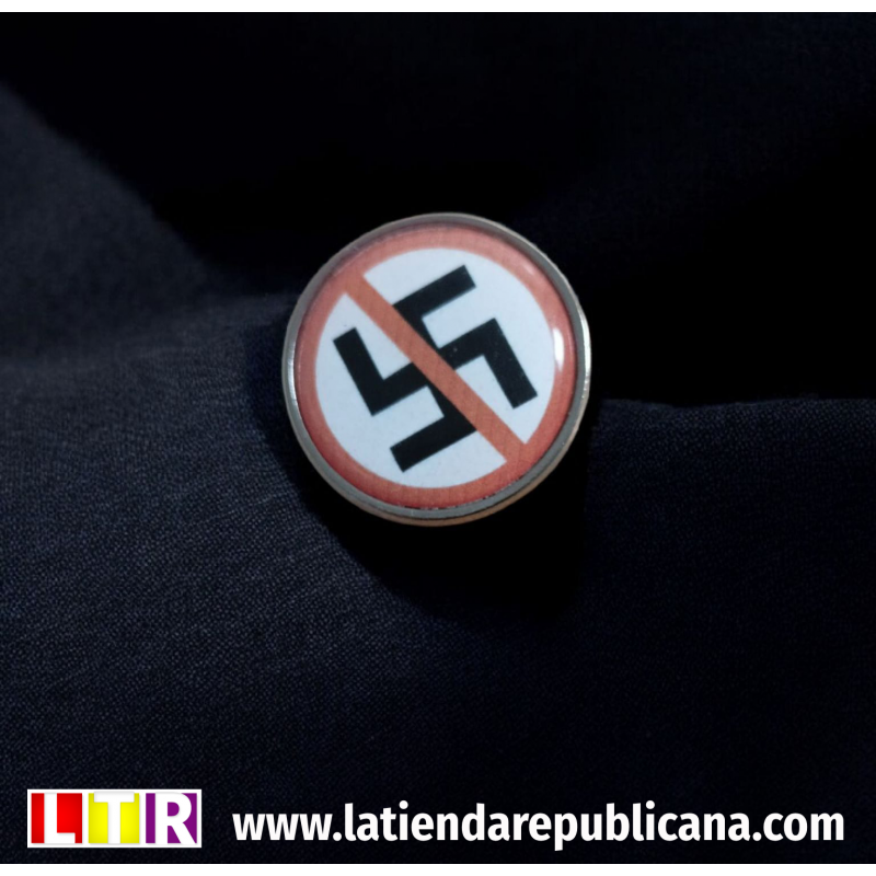 Pin Metálico Antifascista. Pin metálico de buena calidad con el icono del antifascismo sobre fondo blanco, pin redondo metálico, lacado en colores; rojo, negro y blanco. Diámetro aproximado: 2,5cm.