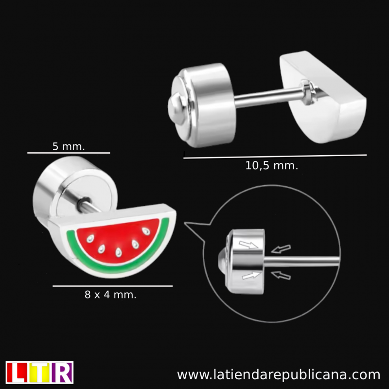 Pendientes pequeños de acero inoxidable de la simbólica sandía. Hipoalergénicos.